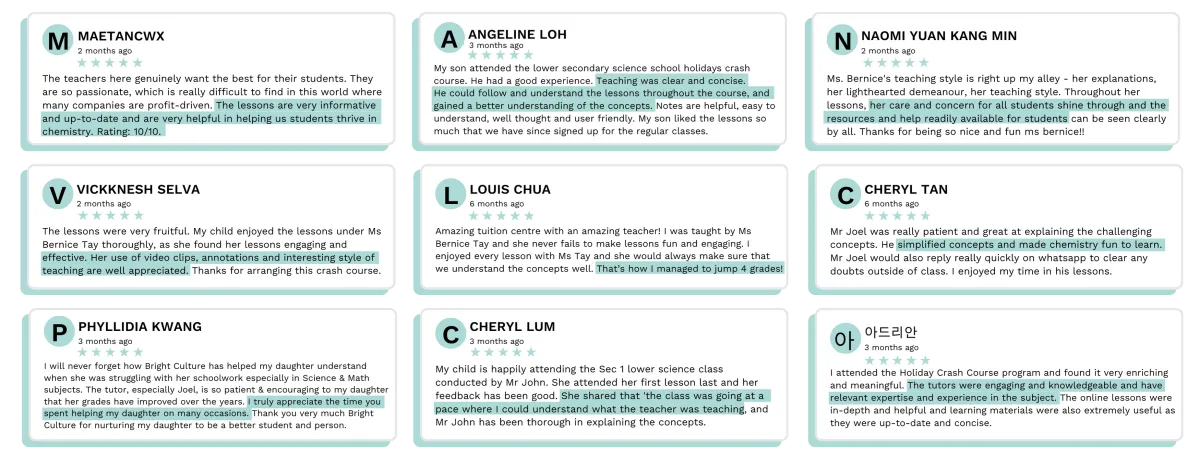 "After attending Bright Culture, I realized that Science was not as hard as I thought. I managed to achieve an A1 for my Lower Sec Science in school..."
